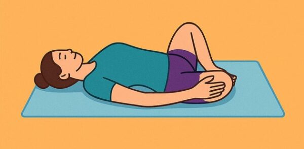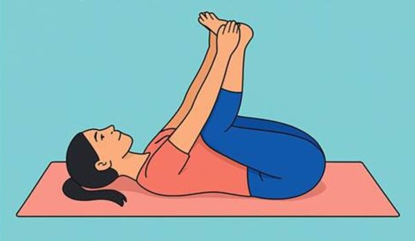 Šťastné dítě – lehni si na záda, přitáhni kolena k hrudníku a chyť se za chodidla. Boky drž na posteli, uvolni ramena a dýchej. Tato pozice protahuje spodní část zad a uvolňuje napětí v kyčlích.
