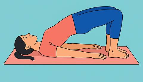Poloviční most – plynule přejdi do polovičního mostu – nohy nech pokrčené, chodidla na posteli. Zvedni pánev nahoru, dokud tělo netvoří přímku od kolen po lopatky. V této poloze vydrž půl minuty a vnímej, jak se celé tělo zapojuje.
